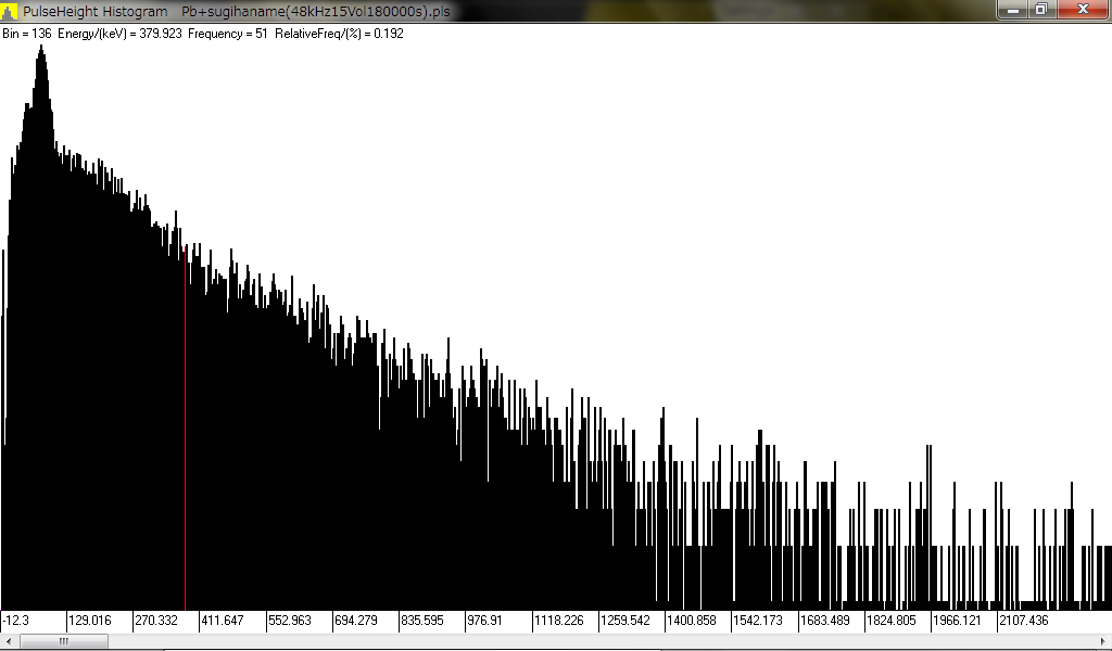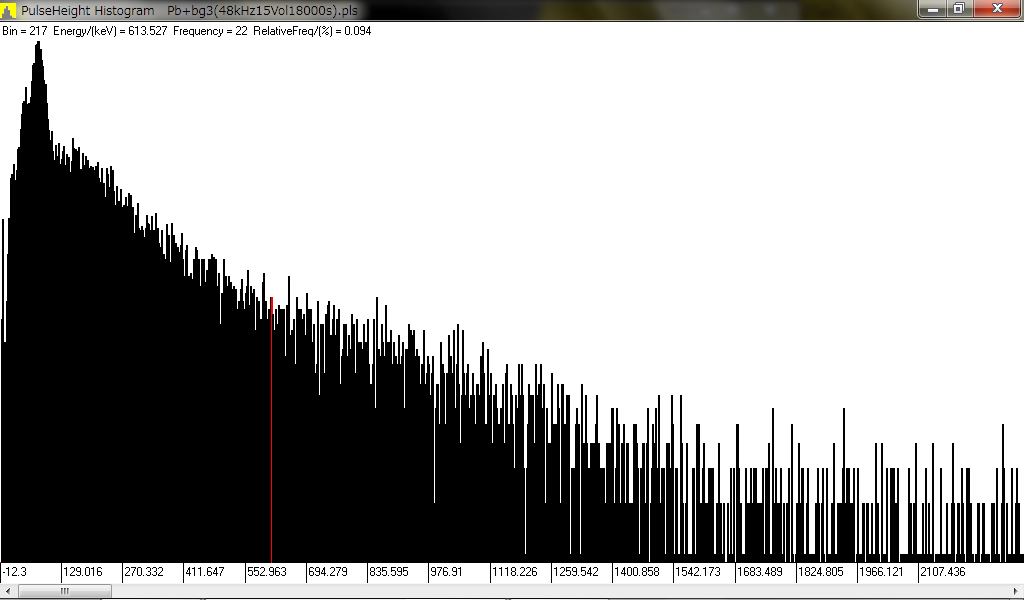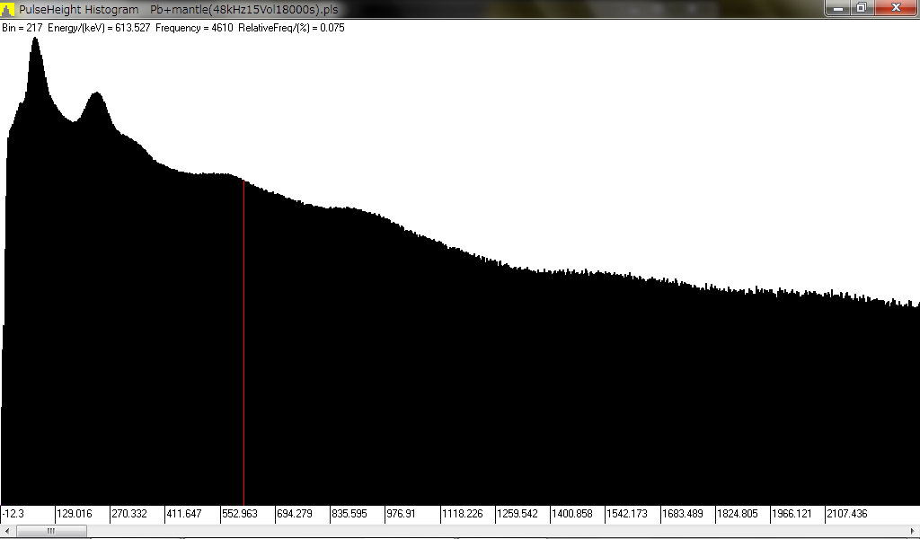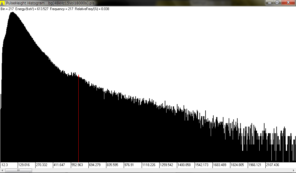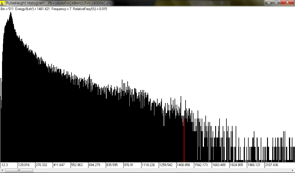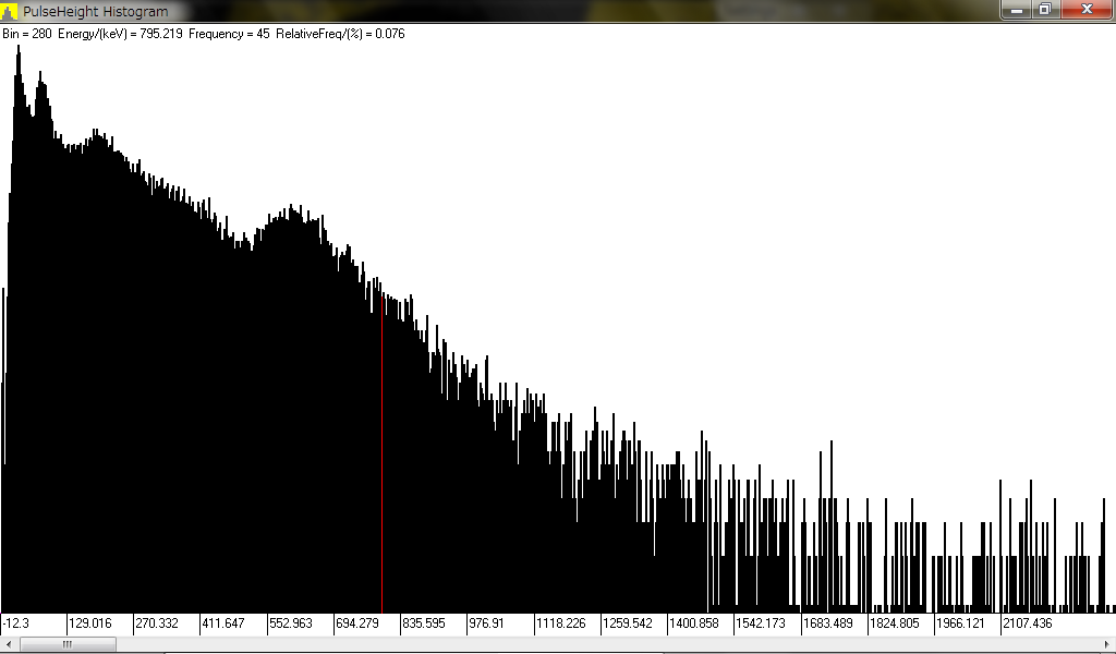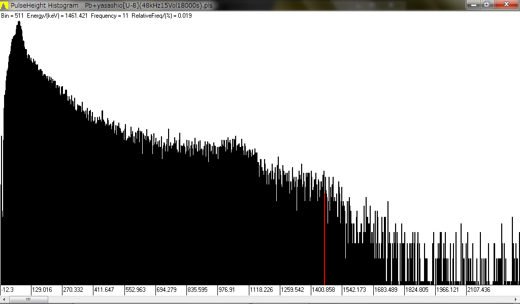 しかし、これは光電効果によるものではなく、コンプトン効果を拾っているようである。また、カリウム由来を測りたいのはエネルギー校正を目的としているので、まったく使いものにはならない。